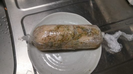 後はお湯を沸かし沸騰したら火を止め、その中にラップに包んだ胸肉を