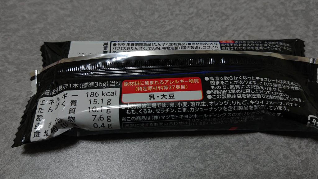 タンパク質が15gと近頃の国産プロテインバーと同等のタンパク質含有量で、