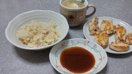 ある日の食事ですが、鶏肉と創味シャンタンと卵のスープ、ジャパンミートの