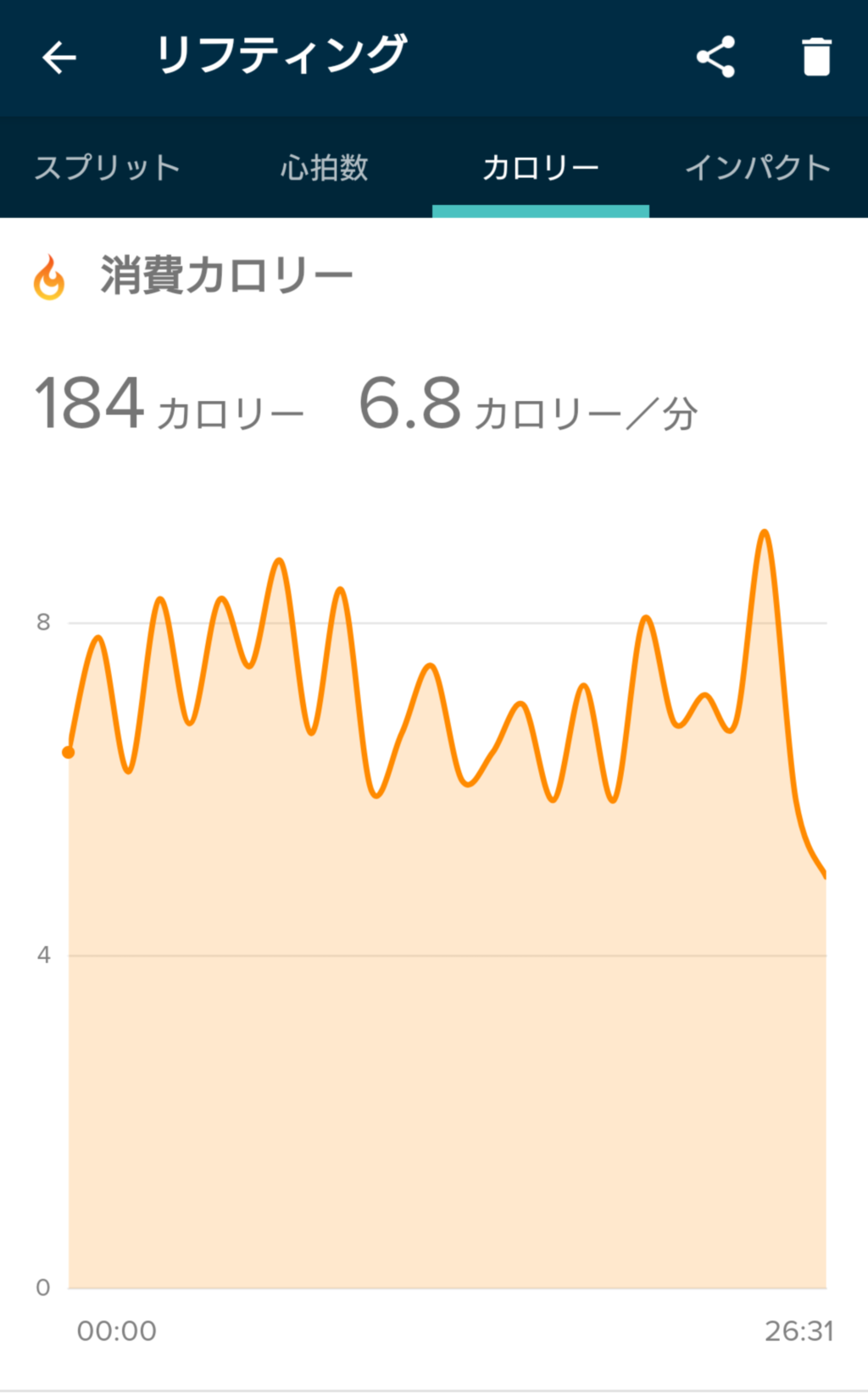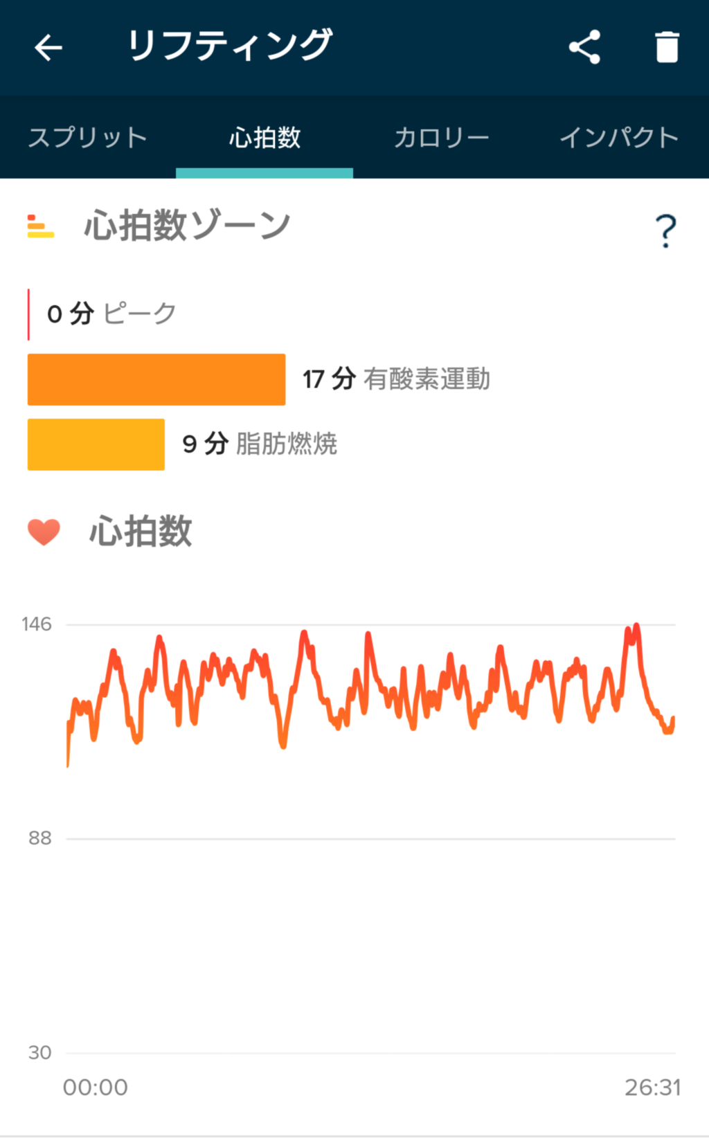 トレーニング時間も記録されていて、休憩含め26分間やって
